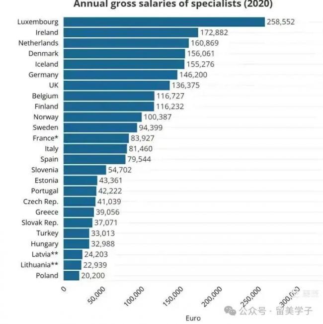 即便和其他发达国家的同行业者相比,美国的医生收入也是相当高的。下图比较了2020年欧洲各国医生的平均收入水平。可以看出,除了卢森堡的医生的平均收入水平超过20万欧元外,其他国家都在二十万以下。