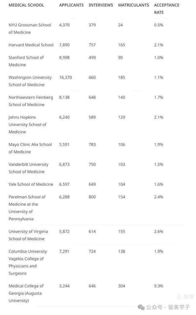 图四,美国顶尖医学院的申请人数,面试人数,录取人数和录取率(2024)