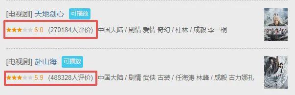 当然,高排播背后,也不全是惊喜,《赴山海》和《天地剑心》表现平平,口碑稀烂,豆瓣成了黑粉和忠粉的Battle圈,打了几个回合,依旧没把口碑打起来,《赴山海》至今离及格线还差一步之遥。