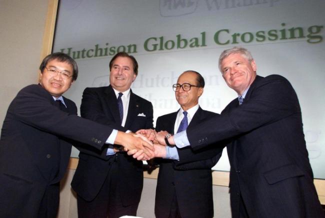 1999年,加里·温尼克(左二)春风得意,当时Global Crossing正在通过一系列交易在全球铺设光纤网络。图片来源:ROBYN BECK/AFP/GETTY IMAGES
