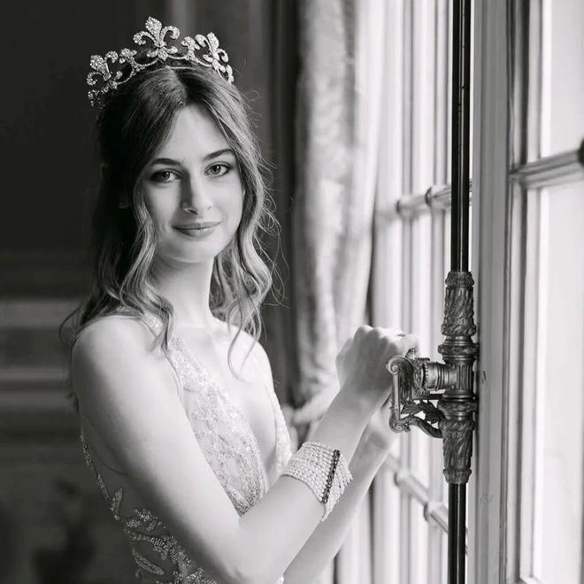 当天她身穿 Tony Ward 的高级定制礼服,头戴象征波旁家族荣耀的“百合冠冕”,这顶王冠制作于 1912 年,代表着百年王室的荣耀与延续。