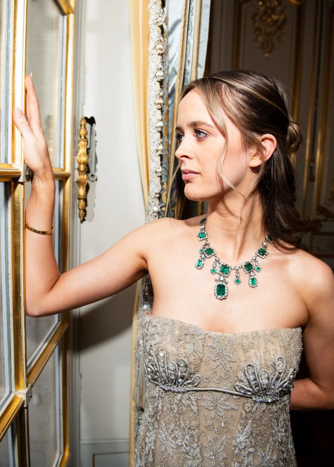 Spencer 是戴安娜王妃的娘家,Churchill 则是英国传奇首相丘吉尔。她的家族世代居住在壮丽的布伦海姆宫,长期致力于教育与文化遗产。她目前就读于牛津布鲁克斯大学,主修活动管理,立志成为一名职业马术三项赛骑手,近年两度代表英国出征青年欧洲锦标赛。所穿礼服来自 Giorgio Armani Privé。