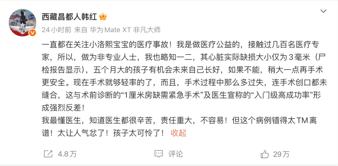 12月20日,歌手韩红也发文称自己一直都在关注小洛熙宝宝的医疗事故。