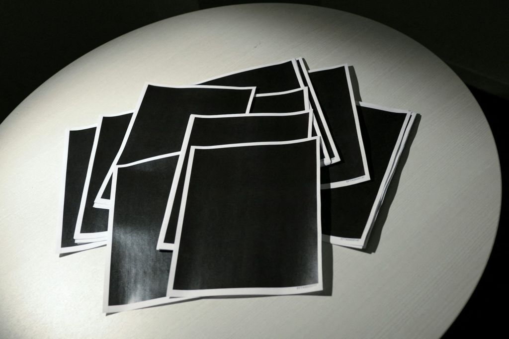 2025 年 12 月 19 日,路透社將美國司法部發布的愛潑斯坦文件列印並排列拍攝,當中有長達116頁的法庭文件被全部塗黑。(Reuters)