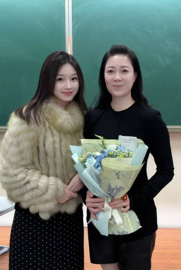 镜头中李文静看上去依旧是温婉端庄,身穿一件简约款黑色连衣裙,气质尤为典雅,被一众学生热情簇拥,李文静手捧花束笑容和蔼,不难看出师生关系和谐融洽。