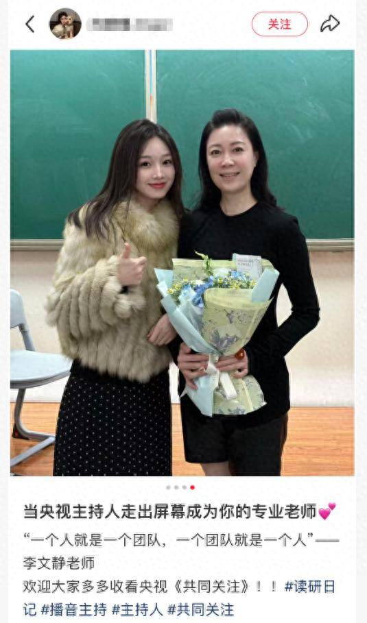 近日,有网友分享出自己与央视主持人李文静的合照,从贴文可以获悉,日前李文静特意来到中央戏剧学院昌平校区讲课,课堂上还与一众同学一起合影。