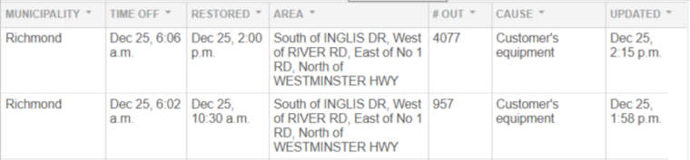 到下午2点左右,列治文所有客户的停电问题都得到了解决。