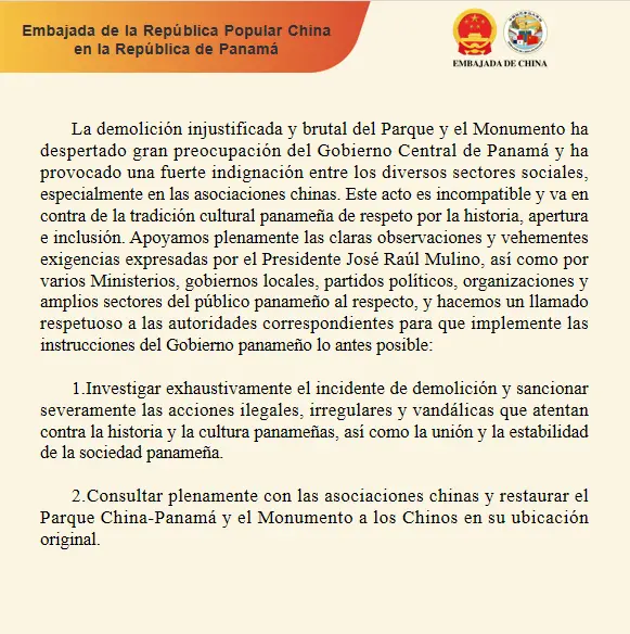 公园和纪念碑遭到无理粗暴拆除,已经引起巴中央政府高度关注和社会各界尤其是华人社团的强烈愤慨。拆除行为同巴拿马尊重历史、开放包容的文化传统格格不入,背道而驰。我们完全赞同穆利诺总统和巴多个政府部门、地方政府、政党、团体,以及广大巴民众就此发表的明确意见和强烈要求,呼吁有关当局尽快采取以下措施: