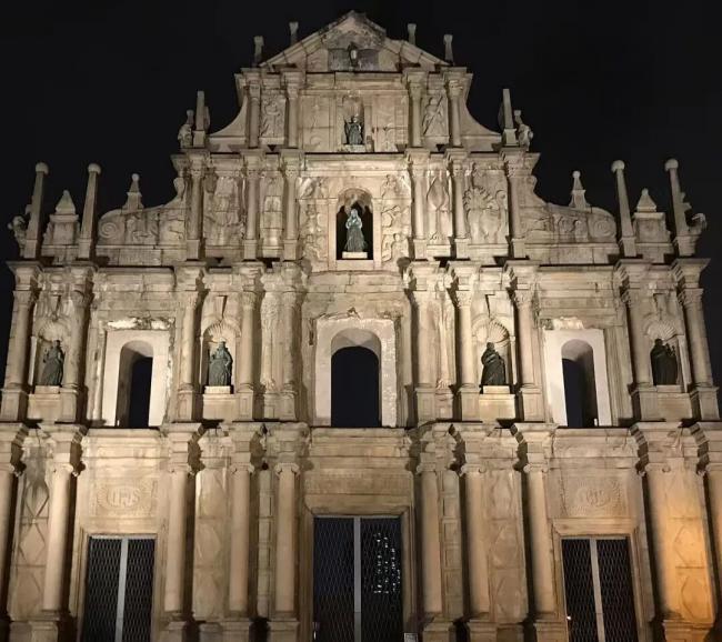 “大三巴牌坊”——本身就是一个中西杂糅的名称。“大三巴”为葡语“圣保禄”(São Paulo)中文音译,“牌坊”则是对其形制的中式“昵称”,它还有一个直观表达身世的名字“圣保禄教堂前壁”。圣保禄教堂最早建于1583年,在1595年和1601年先后发生几次大火而烧毁重建。后来,1630年新教堂落成,1640年加建的前壁和石阶完成,是当时远东最大的天主教石建教堂。又过了两百年,1835年,一场大火让教堂付之一炬,仅余前壁和壁前68级石阶,化身成为澳门最富有价值的瑰丽遗产,也将一段于澳门而言日后能够成为东西文明交汇地的最重要历史“折叠”其中。