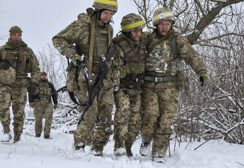 乌克兰第65独立机械化旅新兵29日在札波罗热进行冬季训练。(欧新社)