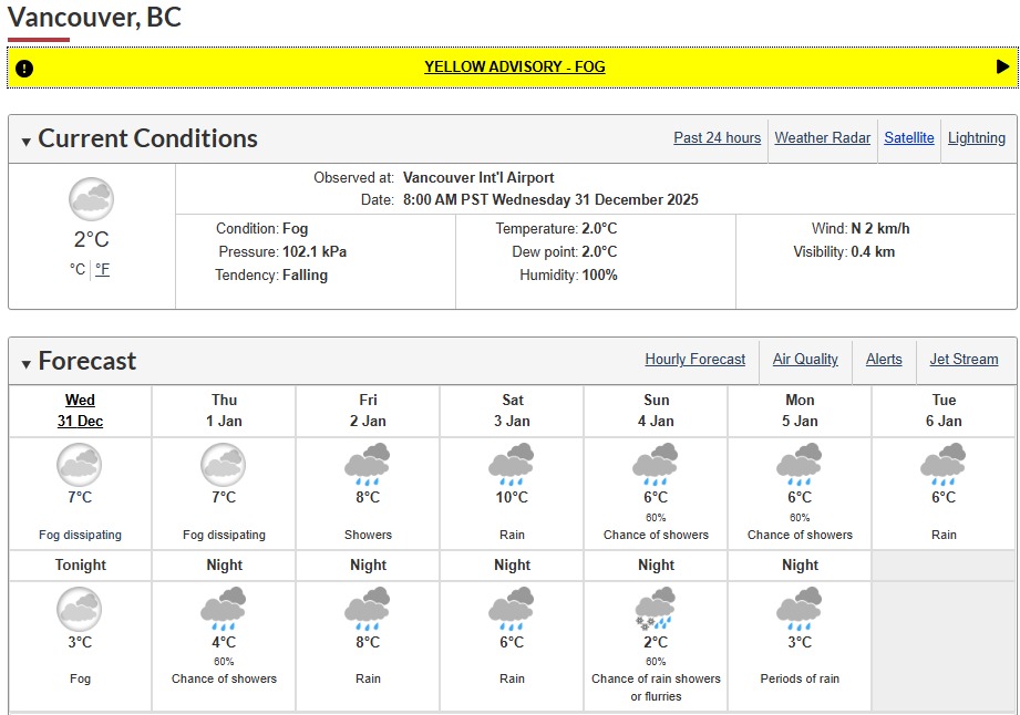 (加西網綜合)加拿大環境與氣候變化部(Environment和Climate Change Canada,簡稱 ECCC)於周叁早晨向大溫地區發布了大霧警告,影響范圍包括溫哥華、本拿比和素裡。