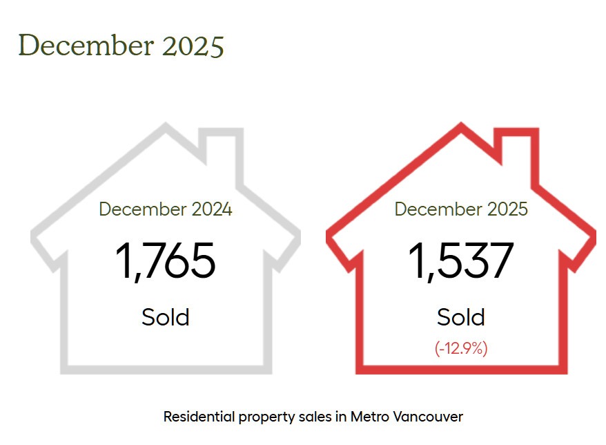 2025 年 12 月,大温地区住宅销售总量为 1,537 套,比 2024 年 12 月的 1,765 套减少了 12.9%。这比 10 年的季节平均值(1,937 套)低了 20.7%。