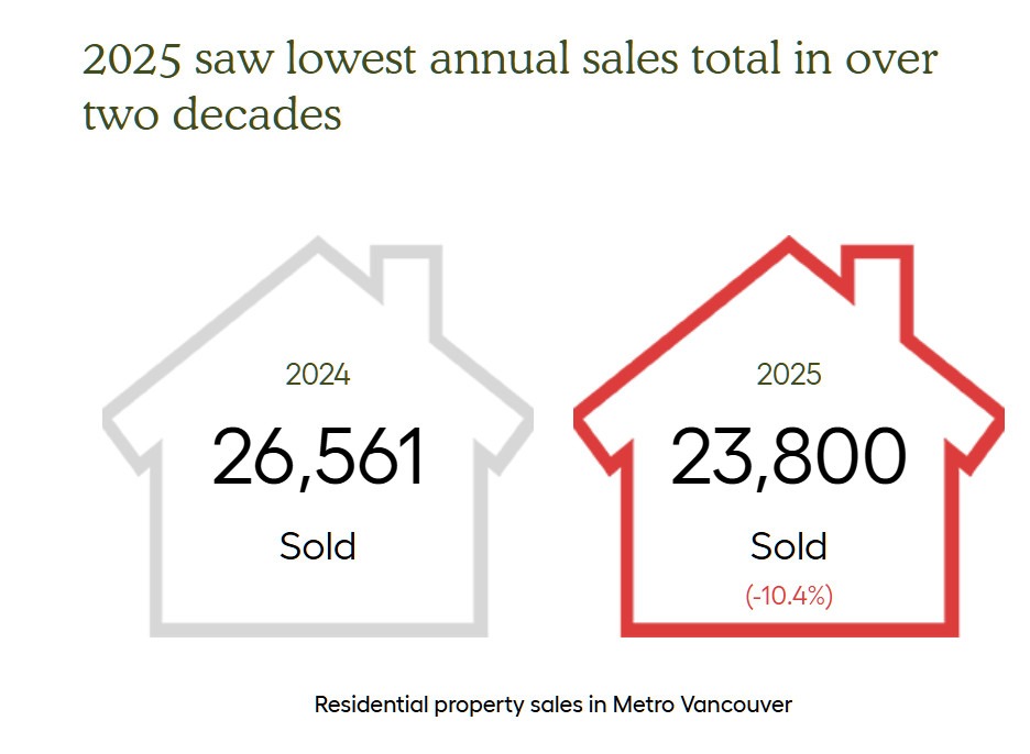 大温房地产经纪人协会 (GVR) 报告称,该地区 2025 年的住宅销售总量为 23,800 套,比 2024 年记录的 26,561 套销售量下降了 10.4%,比 2023 年的 26,249 套销售量下降了 9.3%。