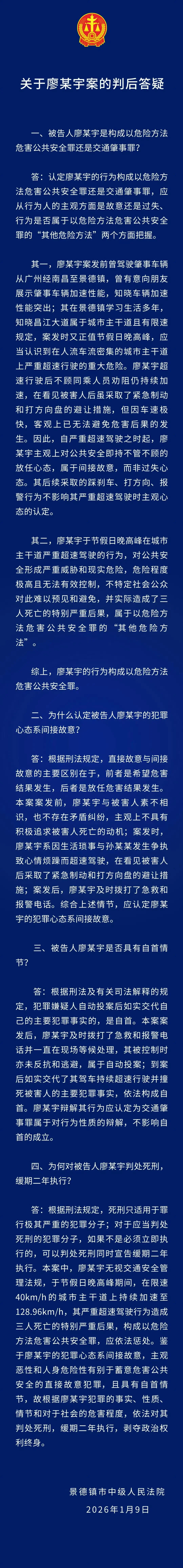 1月9日上午,“一家三口被撞身亡案”在江西景德镇市中级人民法院一审宣判,被告人廖某某以危险方法危害公共安全罪被判处死缓,缓期两年执行,剥夺政治权利终身。宣判后,中国新闻周刊从被害人家属代理律师处获悉,廖某某未当庭表达歉意,双方家属听到判决后都很激动,被害人家属认为判决未达到预期,将申请检察院抗诉。