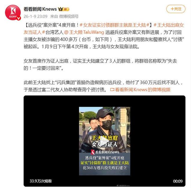 台湾艺人王大陆的“讨债风云”迎来戏剧性转折。1月9日下午,该案第四次开庭,王大陆与主播女友阙沐轩一同现身法院。而这次庭审,女友从旁听席走到了证人席,一记关键指认,让王大陆此前“不知情”的辩解彻底站不住脚。