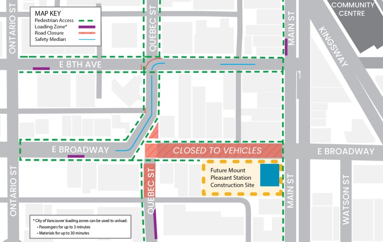 早在2025年10月省政府公布的信息,东百老汇街介于缅街与魁北克街(Quebec Street)之间的一段一个街区进行全封闭,禁止所有车辆通行。此次封路是为拆除一座临时四车道路面钢结构桥,该桥于2022年4月完工,用于配合千禧线(Millennium Line)百老汇延伸段Mount Pleasant站的地下施工。