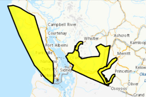 加拿大环境与气候变化部(ECCC)已发布黄色天气警报,该机构称一股大气河流持续为该地区带来强降雨。