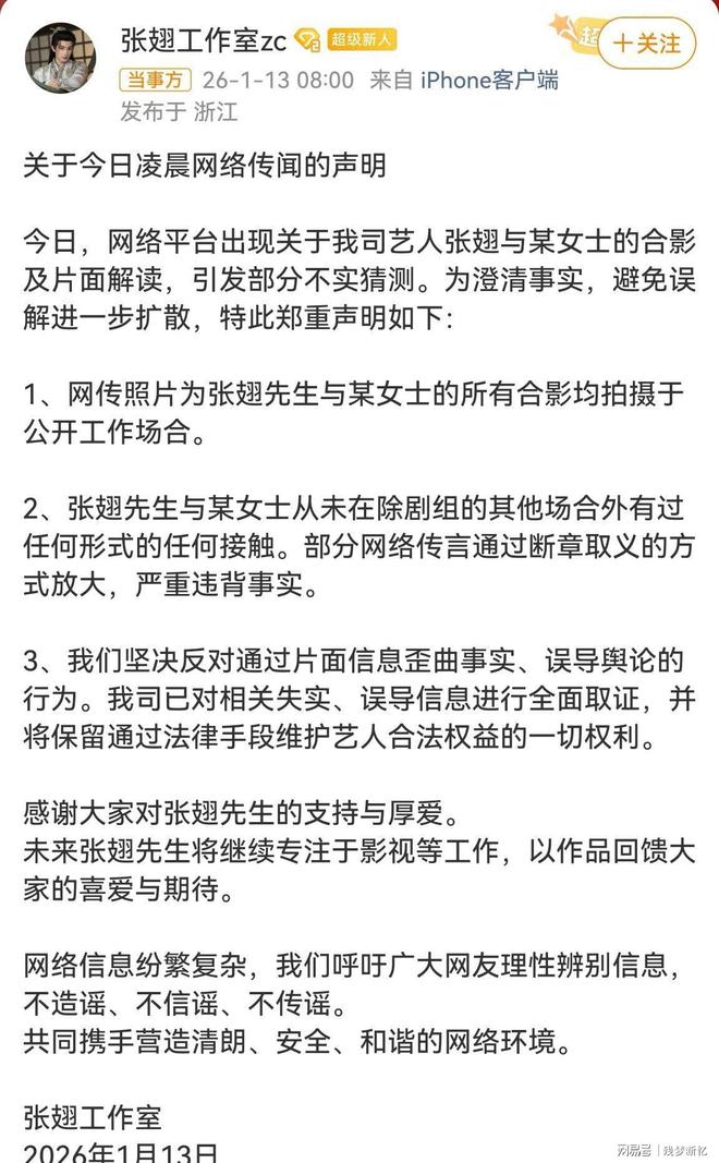 今日上午8点,张翅工作室通过新注册账号发布声明强调三点:一是所有合影均为剧组公开场合拍摄;二人从未在剧组外有任何接触;三是已对不实信息取证并将法律追责。声明呼吁网友"不传谣"。