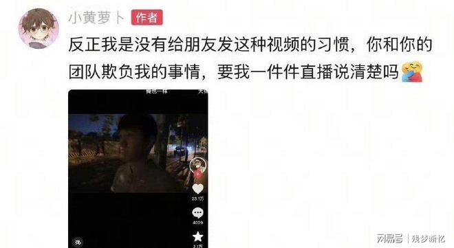女方二次反击,暗示欺压行为 ,针对工作室声明,小黄萝卜在评论区反驳:"反正我是没有给朋友发这种视频的习惯",并质问"你和你的团队欺负我的事情,要我一件件直播说清楚吗?",暗示可能涉及职场欺压或情感纠纷。其歌手好友蓝心羽(《阿拉斯加海湾》原唱)的安慰评论进一步引发联想。
