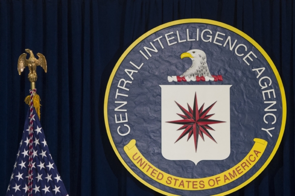 位于弗吉尼亚州兰利(Langley)的中央情报局(CIA)总部,中央情报局的印章矗立在美国国旗旁。(Saul Loeb/AFP)