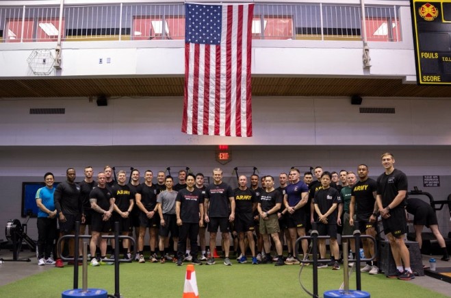 ▲ 15日,美国国防部长皮特·赫格塞思与日本防卫大臣小泉进次郎在陆军基地一同进行体能训练后,正在与士兵们合影留念。/美国国防部