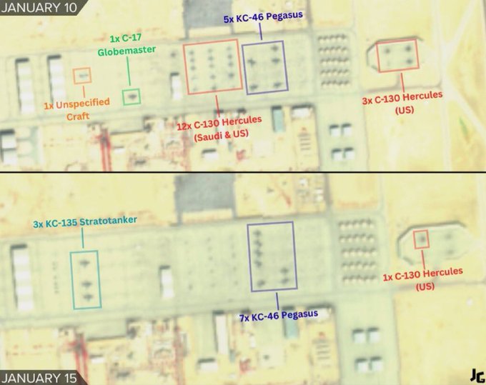 同时,卫星图像显示,美军与沙特已将普林斯·苏尔坦空军基地的非必要飞机撤离,目前基地仅保留加油机!