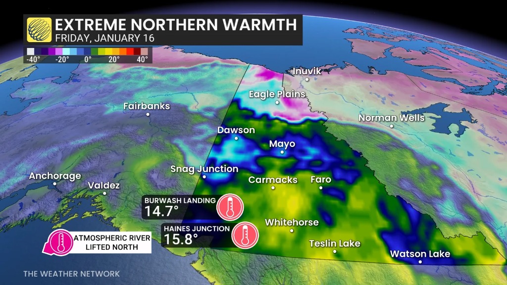 - 海恩斯交界(Haines Junction):气温达15.8°C,仅差0.7°C就打破了1月的历史最高纪录!可以说,育空的1月和佛罗里达的1月根本不是一个级别。