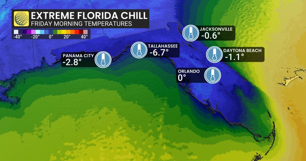 与此同时,佛罗里达的情况却截然不同。周五,佛州多个城市气温跌破冰点,直接进入“冻僵模式”: