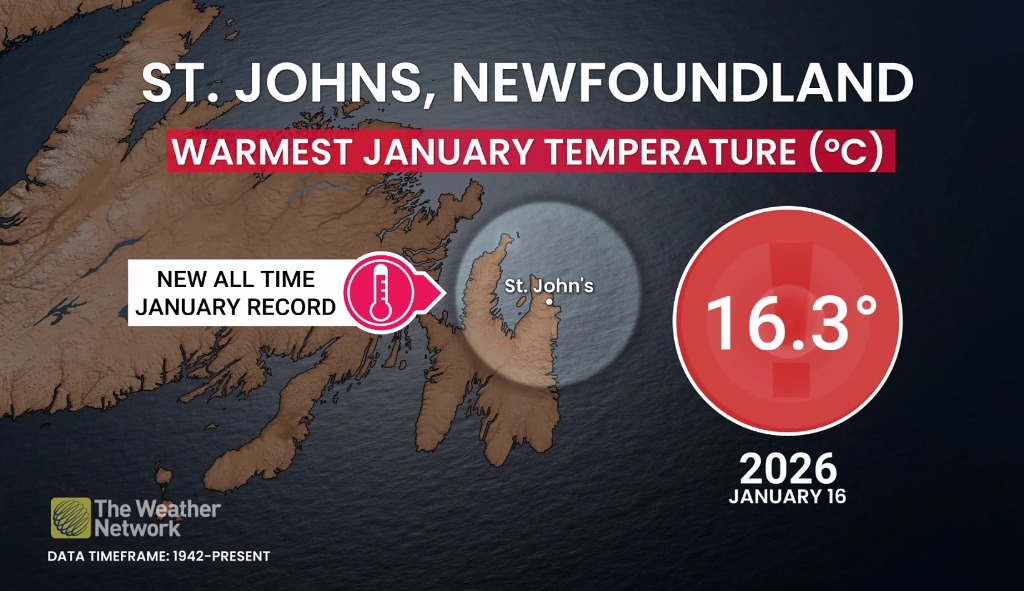 - 格雷茨湾(Grates Cove):16.7°C,离1月的历史纪录仅差0.3°C,简直可以说是“春意盎然”!