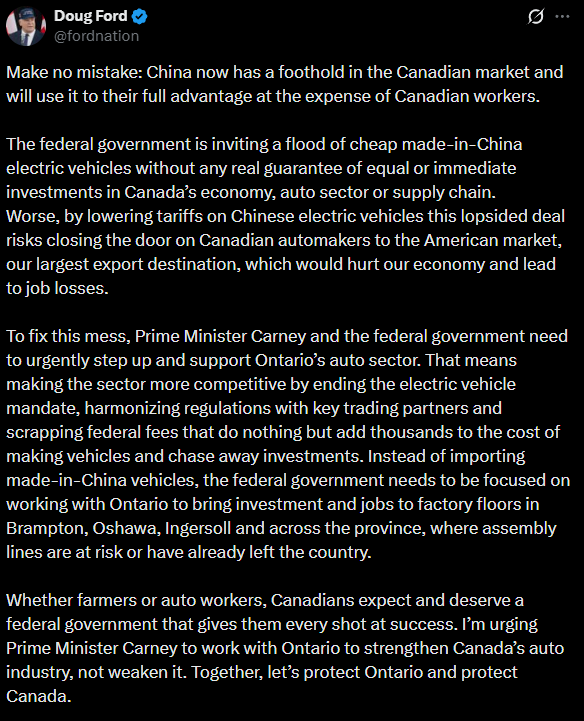 安省省长福特在X平台上警告称,该协议可能为中国在加拿大汽车市场立足提供机会,并可能使加拿大进入其最大出口市场——美国——的通道更加复杂。他认为,如果不配套更强有力的本土汽车制造保护措施,这项协议将威胁加拿大制造业就业。