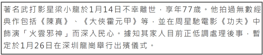 又有一位武打影星离开了!据港媒报道,港星梁小龙于1月14日去世,享年77岁。曾因为出演周星驰电影《功夫》中“火云邪神”一角在内地爆红,而随着他的离世,“香港(专题)四小龙”也只剩下成龙跟狄龙了。
