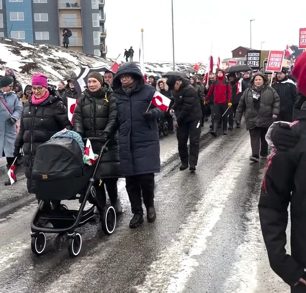 在總人口僅有2萬的努克,數千名抗議者走上街頭,高舉“讓美國走開”“格陵蘭已經很好”“美國佬,滾回家!”等抗議口號,反對美國政府奪取格陵蘭島的企圖。尼爾森也出現在抗議人群中,當他舉起格陵蘭旗幟時,抗議人群發出歡呼聲。