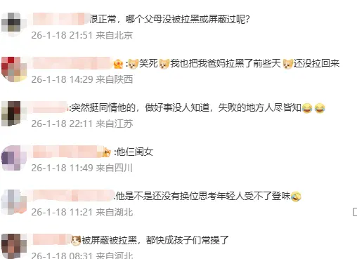 更多网友表示共情,称“哪个父母没被拉黑或屏蔽过”,调侃这已是亲子间的常规操作。
