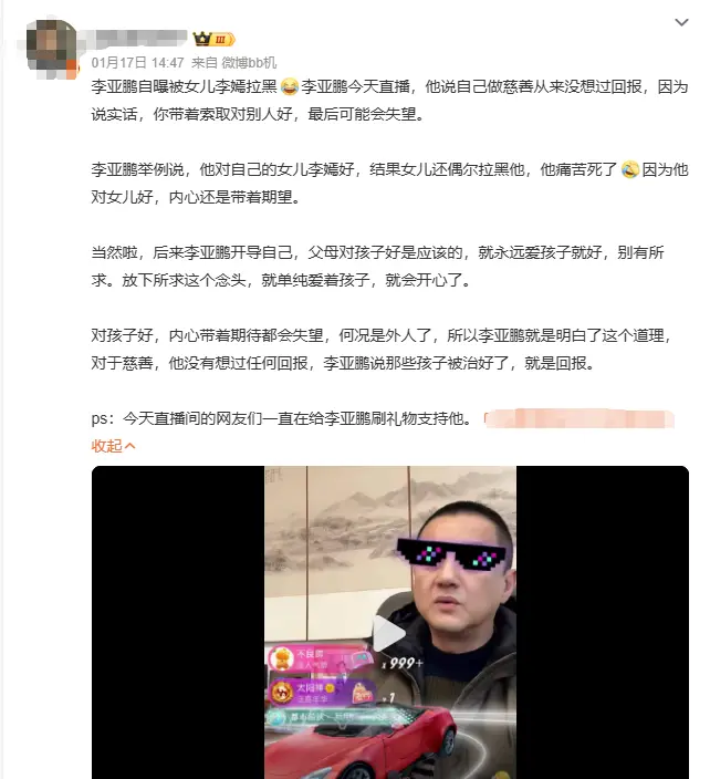 近日,李亚鹏自曝被女儿李嫣拉黑,他说自己做慈善从来没想过回报,你带着索取对别人好,最后可能会失望。
