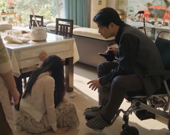 母亲做好一桌子饭,就在端汤的时候,女主不小心将盖子打碎,随后姐索性往地上一坐就是开嚎。