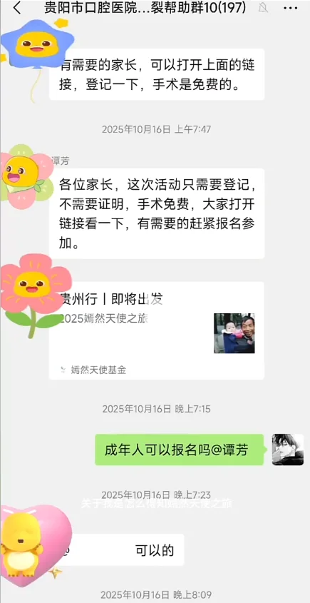 自己是在“嫣然天使之旅貴州行”公益活動中報名的,起初並不敢相信是真的,抱著試試看的心情填寫了信息。