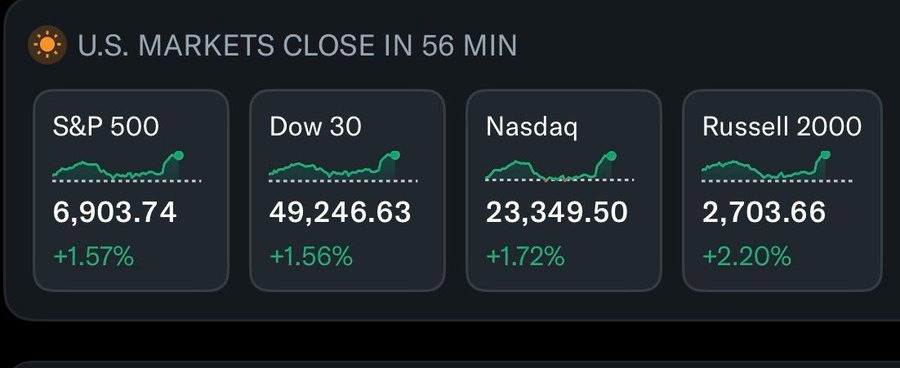 特朗普發布聲明後,美國股市迅速走高。此前,由於特朗普在格陵蘭問題上態度日益強硬,市場壹度承壓下挫。