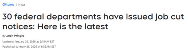 叁大聯邦工會提供的數據顯示,截至目前,已有30個聯邦部門在12月和1月向員工發出了相關通知。發放“人員調整通知”(workforce adjustment notice)是整個流程的壹環,但收到通知並不等於壹定會被裁員。僅在過去兩周內,就已發出超過1.5萬份通知,其中1月18日當周就發出了約1萬份。