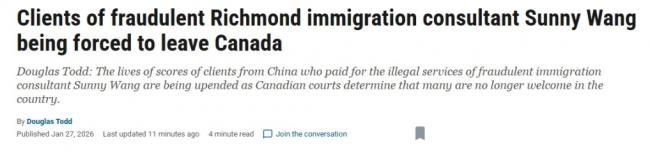 據早前報道,無執照移民顧問王訊(Sunny Wang)在8年時間裡,通過為數百名客戶偽造中國護照和虛假身份,斂財高達 1000萬加元,堪稱加拿大歷史上規模最大的移民詐騙案之壹。王於2015年被判入獄7年,並因逃稅被罰款90萬加元。