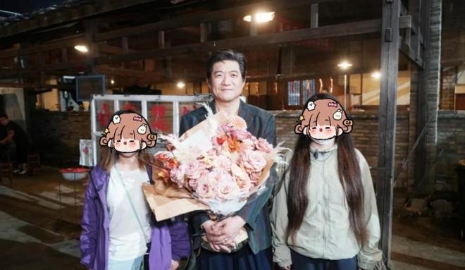 陈明昊捧着鲜花穿西装,一看就是杀青宴的标配,他演的解春来是朱媛媛角色高雪梅的丈夫,戏里夫妻情深,戏外这张合影只剩怀念。