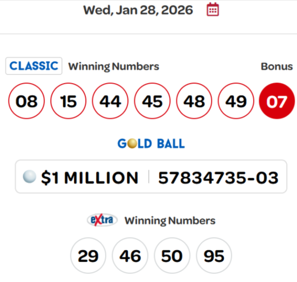 1月28日开奖的Lotto 6/49中,金球没有被抽出,但有一人中了白球中奖号码57834735-03,赢得了100万加元奖金。