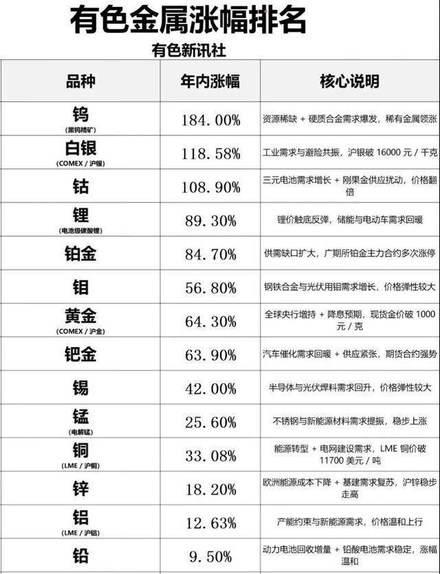 2025年全球的有色金属价格涨势相当凶猛,全年铜价涨幅超过40%,钼涨幅超过50%,锂涨幅超过90%,钴涨幅超过100%,银涨幅更是超过120%。