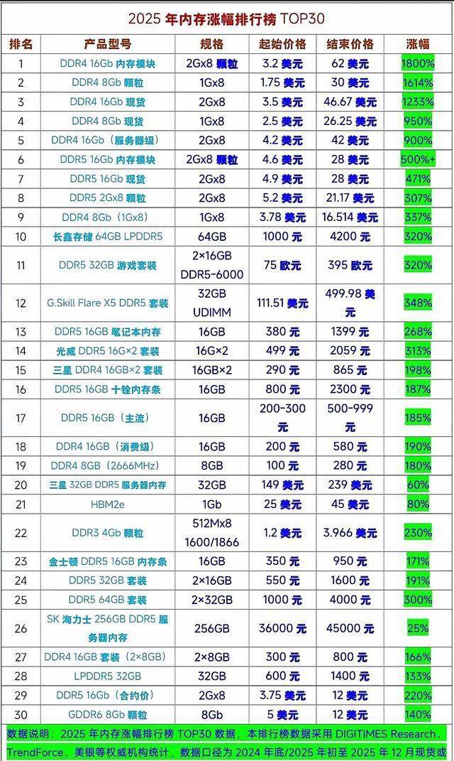 当然除了有色金属大幅上涨之外,内存的涨幅也相当夸张,大多数内存条涨幅都超过100%,极个别产品涨幅甚至超过1000%,相当于涨了10倍以上。