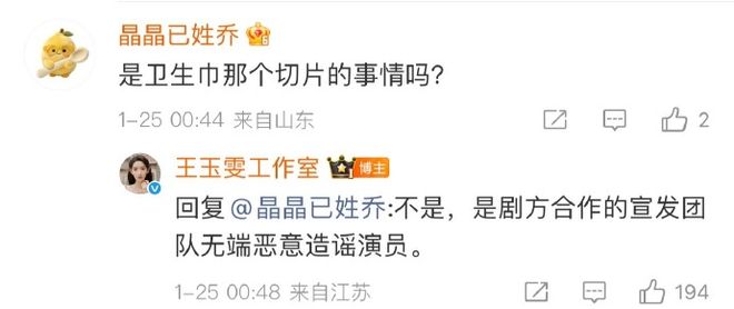 有网友在评论区吃瓜,问是不是“卫生巾切片那个事”,工作室明确回复:不是,是剧方合作的宣发团队无端恶意造谣演员。