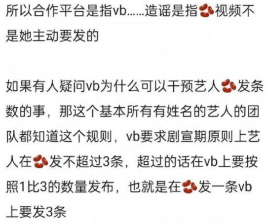 所以工作室说的合作平台是微博,造谣是指对方声称王姐自己非要发抖音。这里还有个补充潜规则,是微博要求艺人剧宣期间,在抖音发视频不能超过3条,一旦超过的话,在微博就得按3倍数量来发。