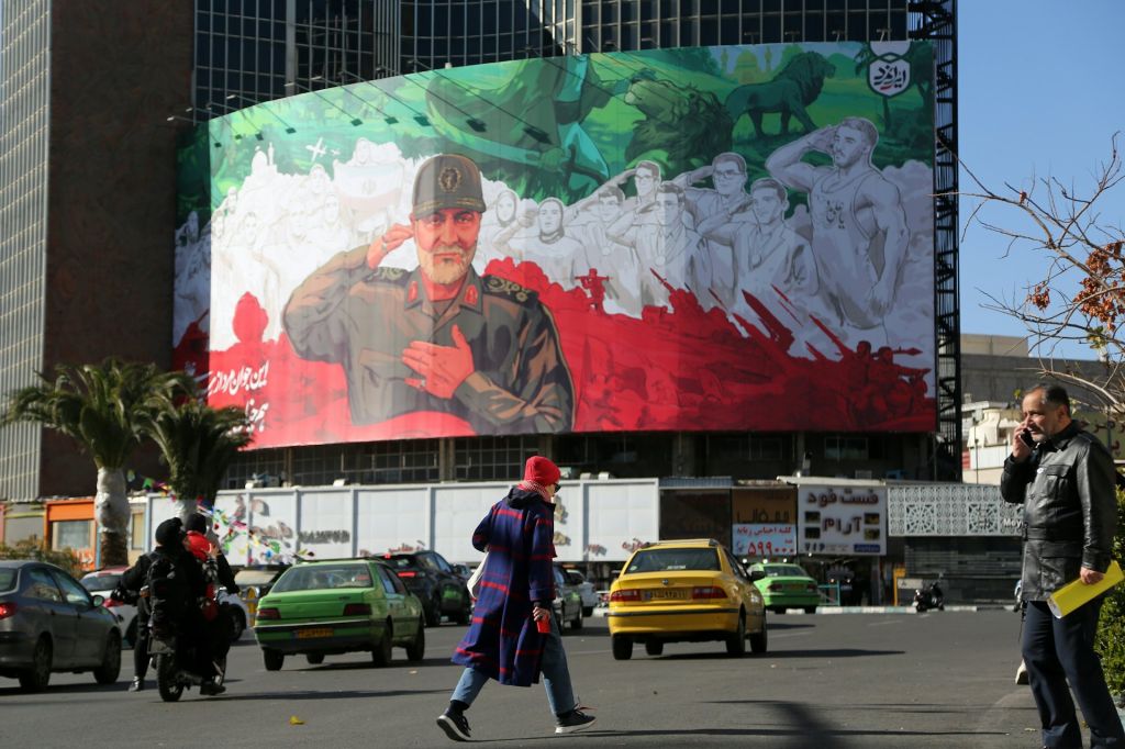 圖為2025年12月30日:在伊朗首都德黑蘭,印有伊朗伊斯蘭革命衛隊(IRGC)已故「聖城軍」指揮官蘇萊曼尼(Qassem Soleimani)肖像的橫額高掛,以供民眾紀念。(Getty Images)