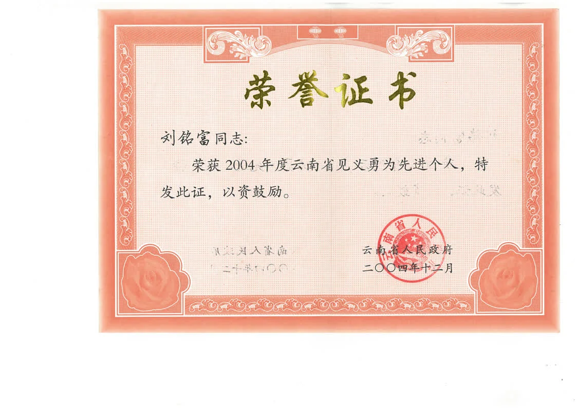 2004年12月,刘铭富被云南省政府授予“云南省见义勇为先进个人”光荣称号。