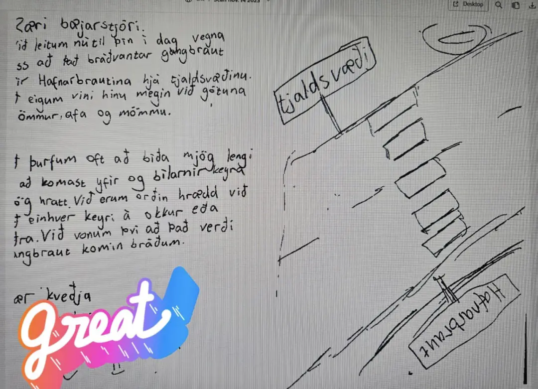 有壹次,她在系統裡看到壹封來信。信寫得認真又稚拙,附著壹幅手繪示意圖,建議在露營地附近增設壹條人行橫道。