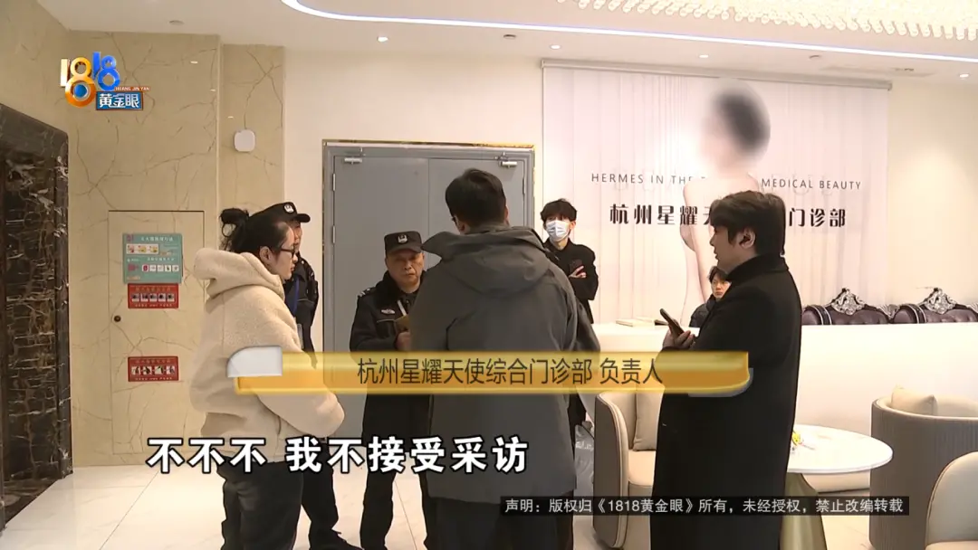 我们自然也要听听门诊部的看法,一行人来到杭州星耀天使的门店,有梯控,工作人员没让记者上楼,应女士报了警,等了将近一个小时,负责人赶到了现场。