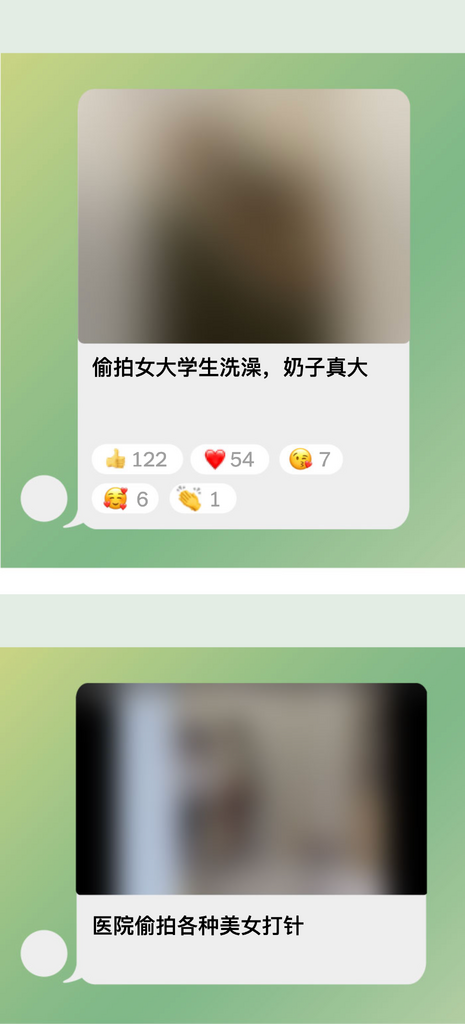 借助Telegram的匿名性、隐藏摄像头的普及和中国在线支付应用程序的便利性,中国女性和女孩偷拍影像的庞大交易正蓬勃发展。人们分享和交易女友、妻子、亲戚和熟人的照片和视频——这种做法在中文被称为“偷拍出卖”。他们还交换陌生人的此类视频。
